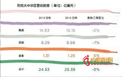 这是中美两国在体育用品市场的“大势”不同:在汽车、智能手机等行业,外企们纷纷宣布中国是其最重要的第一大市场。但对耐克而言,中国只是第二大市场,且和北美市场相差悬殊:2013财年,耐克大中华区收入为24.5亿美元,北美区的收入达到103.8亿美元。