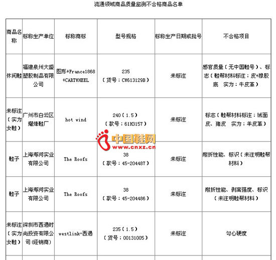 【中国鞋网-品牌动态】北京市工商局日前公示的流通领域鞋类商品质量监测结果显示,The Roofs、westlink•、Charles&Keith、Ochirly、HARSON等标称品牌商品上不合格名单。
