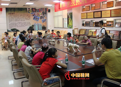 在明伟鞋服有限公司会议室,小记者们与企业营销总监李明池进行了面对面的互动交流。