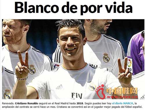【中国鞋网-体坛快讯】C罗已经与皇马续约!本周一晚,几乎是毫无预兆的,西班牙《马卡报》更新了这记重磅新闻。名记米格尔•塞纳诺从皇马内部得到消息,葡萄牙球星已经与皇马签署了一份为期5年的新合同,即续约至2018年夏天(Cristiano Ronaldo has renewed his contract and will be staying at Real Madrid till 2018),C罗在未来五年内的税后年薪上涨为1700万欧元,比梅西高出100万欧元(梅西在巴萨年薪为1300万欧元加300万欧元浮动),但毫无疑问,对皇马来说,只要C罗愿意在新合同上签字,付出再多也是值得的。