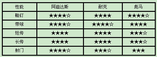 则在鞋钉和射门两个方面稍弱一点,其他方面足以和阿迪叫板。彪马在足球鞋上虽然暂处下风,但悠久的历史和对于技术的不懈追求让彪马在足球鞋市场中仍然占有重要一席。