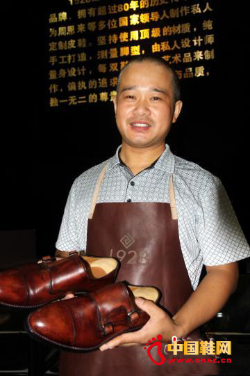 “1928顶级定制”的制鞋师展示手工定制皮鞋,售价超万元人民币。