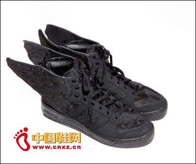 这次联名鞋款选用了Jeremy Scott x adidas Originals经典鞋款JS Wings 2.0作为原型,以全黑的厚帆布作为鞋面材质并配以皮质内衬;而鞋面元素则参考了此前“美国国旗”限定的版本,左右脚分别选用条纹和星星图案,并配以更为高阶的刺绣工艺登场。据悉一同登场的还将包括包括短Tee在内的服饰单品。(中国鞋网-最权威最专业的鞋业资讯中心,合作媒体: )