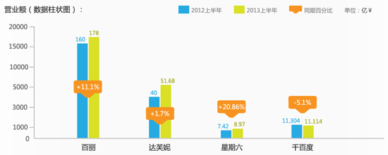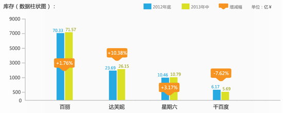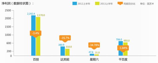 近日,百丽发布上半年业绩公告,收入按年增长11.1%至178亿元人民币,但纯利跌3.4%至21.7亿元,去年同期为22.4亿,存货金额为71.57亿元,与去年底的70.32亿元相比仅增加了1.8%。达芙妮业绩公告显示,上半年,年营业额达51.68亿元,按年增加1.7%,纯利润仅得3.1亿元,降幅达35.7%,存货也由去年的23.69亿港元增加至26.15亿港元。另一上市女鞋品牌星期六,2013年上半年营业收入为8.97亿元,同比上升20.86%,但净利润同样没能避免下滑,为3104.56万元,同比下降34.78%,存货10.79亿元元,较年初增加3,318.28万元,在实现营业收入增长20.86%的前提下存货仅较年初增长3.17%。 千百度中报预告则称上半年销售额同比下降约5.1%,净利润同比下滑10%-15%。最晚发布中报的千百度业绩报告显示,截止今年6月30日,公司营收同比降1.5%至11.14亿元,纯利为1.21亿元人民币,同比减13.29%,存货达5.7亿人民币,较2012年底6.17亿减少4700万。千百度是上市女鞋企业中唯一营收与净利双降的公司。