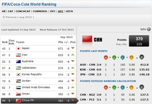 FIFA世界排名:国足跌至99亚洲第9 韩国降亚洲第5