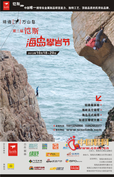 【中国鞋网-攀岩新闻】万山岛位于广东珠海市东南39海里处,每日有多班客船往返,交通极为方便。岛岸曲折迂回,悬崖峭壁,高者达五六十米。攀岩节的主场地风暴角位于大万山岛由一片长约1.5公里的悬崖峭壁和一座小孤岛组成,中间是约25米宽的小海峡,攀岩者需溜索才能到达小孤岛。这也给攀岩活动增加了乐趣。这里早在2010年就被攀岩爱好者发现,并由铠斯开发、赞助,在此已成功举办了两届铠斯海岛攀岩节。