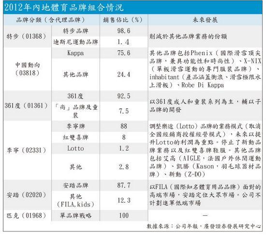 事实上,在体育品牌中,匹克关闭经营不善门店的行动甚为积极,2011年门店数目多达7,806间,但去年已削减至6,483间,大幅减少1,300间,而2013年上半年再减289间,至6,194间;同样大举关店还有李宁,由8,000多间门店减至6,000间左右,反观安踏和特步同期关店数目不足一成。