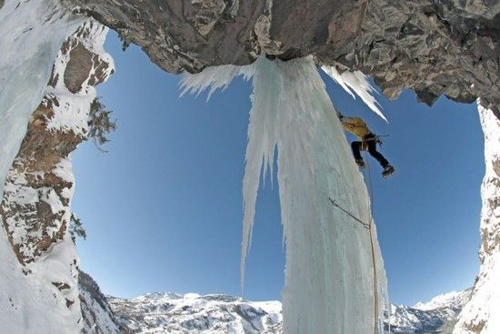 二人当中,40岁的冒险运动摄影师阿兰·丹尼斯在搭档卡里斯特·勒布朗攀爬冰冻瀑布时,迅速拍下这些精彩纷呈的壮丽景象。勇敢无畏的丹尼斯和搭档配备好攀冰工具、螺旋冰锥、防滑冰鞋和安全带,分别都成功地爬完了这处高达30米的冰冻瀑布立柱,耗时仅20分钟。