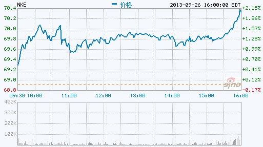 耐克在周四正常交易时段以70.34美元收盘,涨幅为2.06%。截至北京时间9月27日凌晨5点06分,耐克股票在盘后交易时段报价74.35美元,涨幅为5.7%。