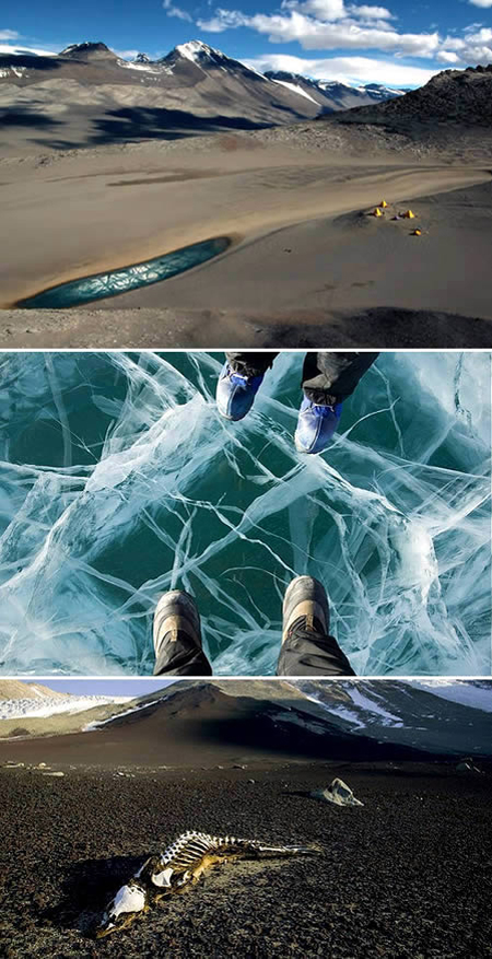 南极洲的干谷(位于维多利亚地以西的麦克默),其荒芜砾石散落地面,被认为是地方地球上最相似火星的地方。其迷人的风景,位于维多利亚地以西的麦克默多海 峡,这里几乎没有降雪,而且除了少数陡峭的岩石,这里是南极洲大陆唯一没有冰的部分。地形并不像这个地球;山谷偶尔发现包含永远冻结湖冰数米厚。在冰下, 在极其咸水,生活神秘简单的有机体,目前这一个奇怪问题正在进行研究。