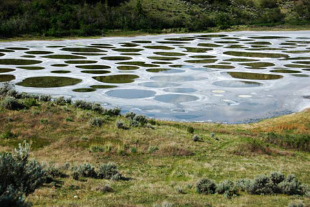 加拿大的斑点湖,位于不列颠省的斑点湖,在夏天的烈日下,湖水蒸发和结晶出了很多矿物质,形成许多白色镶边界线和浅池,富含矿物质的水呈现深浅的蓝、绿等的颜色。它包含了世界上最高浓度的矿物质:硫酸镁、钙、钠硫酸盐等矿物质和微量元素,其中包括银和二氧化钛。