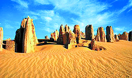 对澳大利亚沙漠的参观在乌卢鲁(澳州艾尔斯岩)处达到高潮。澳州艾尔斯岩高348米,周长9公里,是世界最大的单体巨石。岩石由砂石构成,一天之中色泽会由浅棕色变化到深红色。日出日落时,乌卢鲁美丽绝伦,令人叹为观止。乌卢鲁被称为“澳大利亚的心脏”,是澳大利亚著名标志之一。这块岩石对土著民意义重大,10,000多年来,他们以岩画形式表达其神圣性。