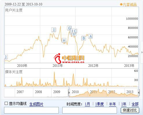 凡客在2013年下半年的百度指数甚至乎低于2010年下半年,还是呈持续下降看不见上升的趋势。看见这样的数据,我都甚至要怀疑百度指数的可信度到底有多少?百度指数,还能作为衡量品牌用户搜索量及媒体曝光度指标否?行,那我们对比来看。