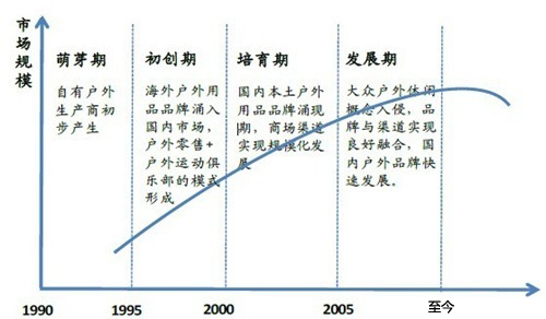 萌芽期:自有户外用品生产企业形成萌芽期。中国户外用品市场起步较西方国家晚了几十年,20世纪90年代之前,在我国户外运动概念还很淡薄,户外用品只是在极小的专业群体中使用,因当时国内没有自主的户外用品生产企业,这些专业人士主要使用国外用品。而在大众消费者心中,对户外运动及户外用品的认知度更是几乎为零。直至1990后,随着沿海地区一些户外用品代工厂商像生产型企业转型,才形成自有的生产厂商,但当时的所生产的产品只是处于初级模仿阶段,无论是产品质量还是专业性能距国际水平均有较大差距。