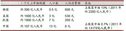虽然国内户外用品市场发展迅猛,但与美国、欧洲及韩国等发达市场比较,还存在一定差距。这主要是由于市场规模及人均消费差距较大。据服装研究所统计,2011年我国户外用品市场规模约为107亿元人民币,人均消费额仅为8元,而户外用品市场较为发达的欧、美国家及韩国同期市场规模分别达到1800亿、1600亿及300亿人民币,人均消费额分别为260元、530元及600元。其次,从户外用品的消费类型看,因我国户外运动兴起较晚,现阶段受制于户外配套场所、设施及消费能力有限,我国户外用品消费目前主要集中在徒步、登山、摄影及垂钓等基础户外运动穿着类消费,而露营、房车野营等户外装备类消费占比较低。