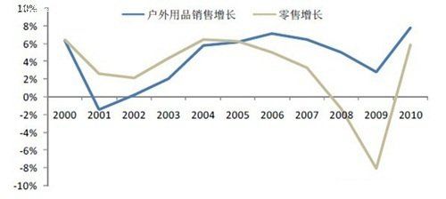 以美国市场为例:服装、户外运动装备及配件、鞋类产品占据市场94%的份额,成为市场最具开发潜力的三大主流产品。其中,尤其是户外服装近年来销售占比呈现逐步提升的态势,而增长较快的则是赤足跑鞋及超轻鞋。据统计,美国人对户外休闲运动直接及连带消费支出要高于对证券投资的规模,达到289亿美元,2011年美国户外用品零售额实现117亿美元,同比增长6.1%,较快于美国零售业的整体增速,其中,专业户外用品零售额占比约为27%左右,同样保持相对稳定的增长。