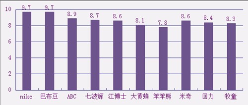 美誉度前三甲均被老牌制鞋企业占据。NIKE与并列美誉度第一;以巴布豆多年领军童鞋市场的影响,再次斩获桂冠属正常表现;NIKE作为体育用品的世界级品牌,在国内童鞋领域推展相对较晚,仍在儿童领域表现突出。位列第三的ABC则是国内较早从事童鞋运营的品牌之一。