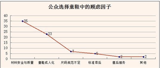 研究中也发现,公众对童鞋选购中的主要顾虑为“材料安全与质量”、“童鞋成人化”、“尺码混乱不够规范”三大方面;并且有相当比重的消费者认为国内童鞋业缺乏有效标准作为选购参考。