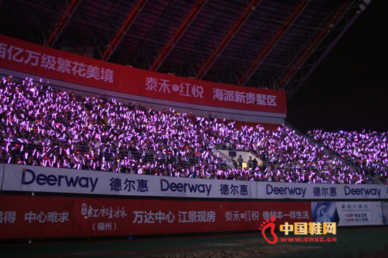 【中国鞋网-品牌动态】10.19日,“魔天伦”周杰伦演唱会唱响福州站。当晚的宣传片在现场大屏幕播放,一个个熟悉的画面呈现在全场歌迷面前时,掌声、欢呼声响彻一片。歌迷挥舞着手中的荧光棒,齐声呼喊着“周杰伦”、“周杰伦”,顿时掀起了演唱会的第一个高潮。