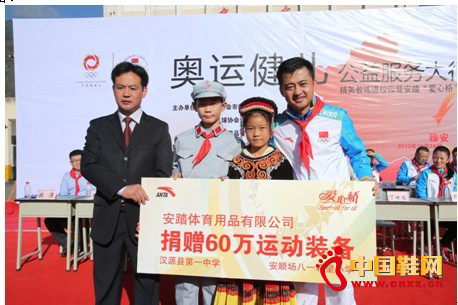长期以来安踏一直都在积极履行企业社会责任,作为中国体育用品行业的领导品牌,安踏长期关注体育公益领域。今年1月份,安踏和中国奥委会、萨马兰奇体育发展基金会、冠军基金共同成立了“奥林匹克公益合作联盟”,联盟旨在通过跨领域的合作,倡导社会力量参与奥林匹克运动与体育公益事业在中国的推广。4月份,联盟发起首个公益项目—“爱心桥”项目,安踏向超过31个省市、直辖市的近200家学校,捐赠了价值2000万元的运动装备,以此推动奥运匹克运动和精神在学校的普及。(中国鞋网-最权威最专业的鞋业资讯中心。合作媒体: )