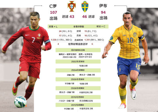 对任何一名球员来说,世界杯都是最美好的挑战。对球迷而言,世界杯也是最令人向往的赛事。不过,不是所有的优秀球员都有机会参加这项赛事。世界杯预选赛每进行一个阶段就会有球星被淘汰出局,这是世界杯小小的悲剧。1954年和1962年的迪·斯蒂法诺,1970年的贝斯特,1994年的坎通纳,1998年的维阿和2002年的吉格斯都在他们球员生涯的巅峰阶段错过世界杯,此后他们也再没有机会参加这项赛事。还有一些球星有幸参加了世界杯,但他们没能在世界杯的赛场上展现自己的才华。伊布和C罗就是这样的球员,他们声名显赫,也参加过世界杯,但他们在世界杯的赛场上没有展现令人难忘的闪光点。如今伊布已经32岁,C罗28岁,命运的安排给他们在巴西世界杯预留了席位,但他们中间只有一个人可以搭上飞往巴西的航班。为了争夺这张入场券,C罗和伊布将展开生死大战。本周五晚(当地时间20点45分),葡萄牙队将在主场迎战瑞典队,展开世界杯预选赛附加赛第一回合的较量。届时,两支球队当中状态上佳的射手也是队长的C罗和伊布将一决雌雄。