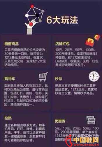 淘宝网同时正式公开了今年双十二的六大玩法:橱窗商品、店铺红包、购物车、秒杀、拉熟、优惠券。