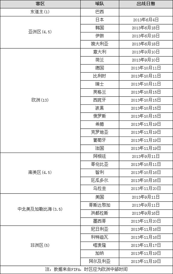 昨天下午,中北美及加勒比海地区的墨西哥队客场4比2战胜新西兰队,总分9比3淘汰对手晋级决赛圈。昨天早些时候,非洲区产生了最后两支出线球队,加纳虽然客场1比2不敌埃及,但是依旧以总比分7比3晋级,成为第四支晋级巴西世界杯的非洲球队。阿尔及利亚主场依靠布盖拉的进球,主场1比0战胜布基纳法索,总比分战成3比3,依靠客场进球的优势晋级巴西世界杯。至此非洲杯五支出线球队全部产生,他们是:尼日利亚、科特迪瓦、喀麦隆、加纳和阿尔及利亚。