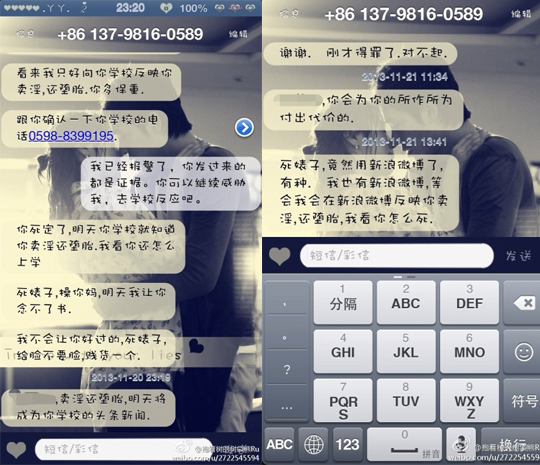 11月20日、21日两天,卖家陆续发了十多条短信,语气从开始的“亲”,变为不堪入目的粗口,还说“上次有个女学生也像你这样不接电话,后来我打电话到她学校去,反映她卖淫还堕胎,后来她被学校开除了”。眼看威胁不起作用,卖家恼羞成怒,称,“不会让你好过的”,也要向学校反映小陈卖淫还堕胎,要让她“成为学校的头条新闻”。