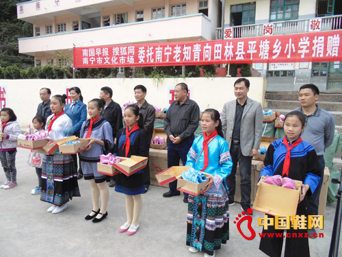 【中国鞋网-滚动快讯】2013年11月25日,“给孩子送双”公益行动为广西百色市田林县平塘中心校捐赠的867双运动鞋发到孩子们手里。孩子们穿上自己名族最鲜艳的服装,迎接来自全国热心叔叔阿姨捐赠的爱心。