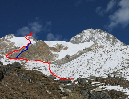 这里有两点需要说明,第一我们攀登的顶峰并非骆驼西峰的真正顶峰,原因主要是由于时间关系,以及我们收到了这个顶峰的金帆的混淆,最后确定登的这个,实际上比左侧的顶低多少我们很难判断。当然当地几个骆驼峰的向导告诉我们不要过去,那边有很大的冰裂缝难以跨越。当然这些都不影响这条新线路的完成。第二点要说明的是这条线路为什么是新线路。在之前我有次骆驼峰的攀登及经历,其中俄罗斯人的搜救应该是相似的线路,但是区别在于蓝色部分是俄罗斯人的攀登线路。我们本来计划是攀登俄罗斯人的蓝色线路,这里改变线路的原因在于,几年以后的今年我来到同样的位置后发现,以前的线路已经变化,我们之前很平缓的沟槽和岩石部分已经不复存在,而我们面对的是一个悬挂的冰川及陡峭的石头和冰壁。