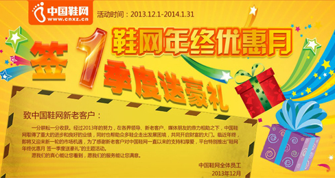 一分耕耘一分收获。经过2013年的努力,在各界领导、新老客户、媒体朋友的鼎力相助之下,中国鞋网取得了重大的进步和良好的业绩,同时也帮助众多鞋企走出发展困境,共同开启财富的大门。临近年终,即将又迎来新一轮的市场机遇,为了感谢新老客户对中国鞋网一直以来的支持和厚爱,平台特别推出“鞋网年终优惠月 签一季度送豪礼”的主题活动。