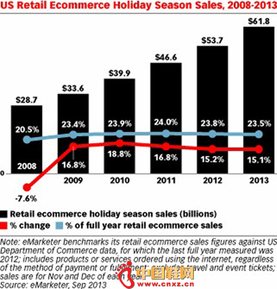 由于年底几个月的销售将占全年零售收益的很大一部分,所以很多一部分花费预计将投入到假日购物者身上。eMarketer预测,今年23.5%的在11月和12月份将达到618亿美元。eMarketer预测,今年美国零售电子商务销售将增长16.4%,达2623亿美元。
