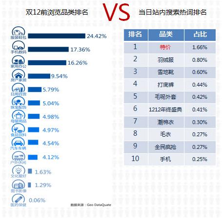双十二之前消费者最关注“服装鞋包”类商品,双十二当天各电商站内搜索热词除“特价”外,“冬季服装”商品最受关注。