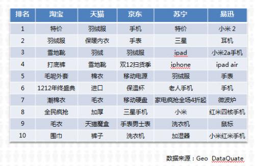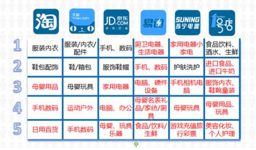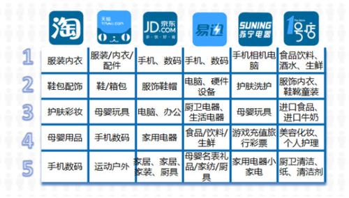 阿里系电商站内,服装类商品被搜索次数最多,京东、苏宁、易迅以手机数码类商品最受关注。
