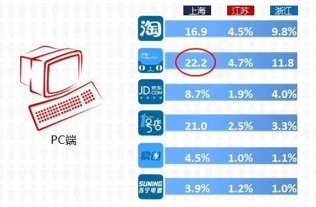 4、在移动端,京东购物车转化率最高,其原因可能是图文适配性和用户体验较好;上海地区PC端和移动端的购物车转化率都高于江苏和浙江;