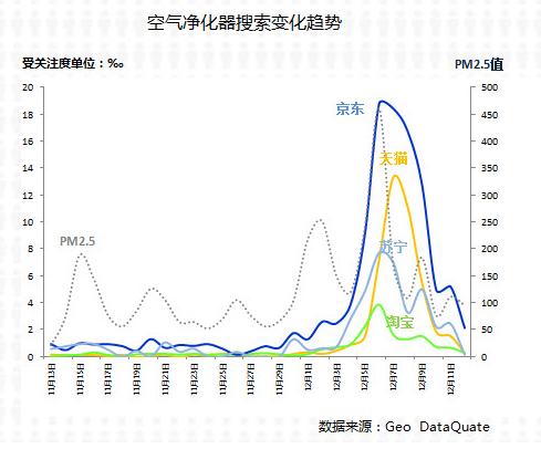 随着网民对污染关注度的上升,空气净化器在各电商的搜索都不断攀升,其中雾霾最严重的12月6日,其搜索关注到达顶点。