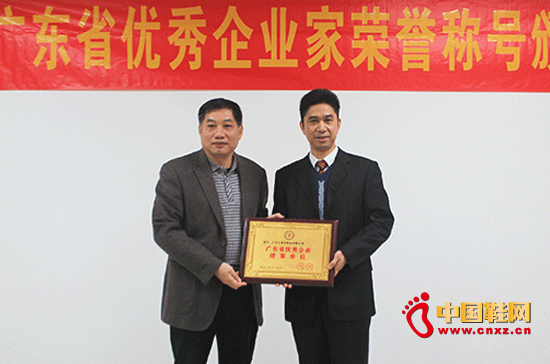 广东省经企联、广东省企业家理事会常务副会长何礼森先生为广东必登高鞋业有限公司董事长梁远光先生颁发了“广东省优秀企业家”荣誉称号证书和牌匾;