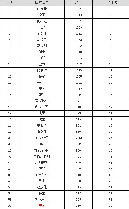 【中国鞋网-体坛快讯】国际足联(FIFA)公布了今年最后一期的国家队积分排名,西班牙、德国、阿根廷分别位列前三,前18名没有变化,法国队小将一位到第20,波黑前进2位排名第19,墨西哥下跌一位出前20。