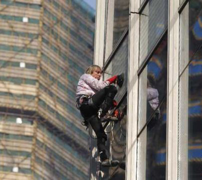 【中国鞋网-攀岩新闻】阿兰·罗在攀爬绍兴世茂天际中心。当日,以徒手攀爬摩天大楼著称的法国“蜘蛛人”阿兰·罗伯特成功徒手爬上高达288米的浙江省绍兴市世茂天际中心。(中国鞋网-最权威最专业的鞋业资讯中心)