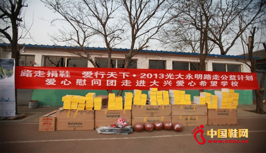 2013年12月24日,寒冷的平安夜来临之前,位于北京市黄村镇的大兴区爱心希望小学的小朋友们,也翘首企盼迎来了今年特殊的“圣诞老人”, “路走捐鞋,爱行天下——2013光大永明人寿路走公益计划”的爱心慰问团,以及他们带来的“圣诞礼物”,400双御寒童鞋和篮球、羽毛球拍、水彩笔等体育学习用品。