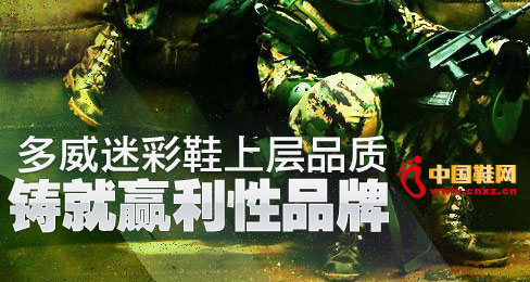 多威迷彩鞋象征着 一种无悔青春、一种强势霸气和一种坚韧精神。多威迷彩鞋品牌也将携手合作伙伴在充满挑战和机遇的市场道路上勇往直前,互利共赢。中国鞋网-最权威最专业的鞋业资讯中心。合作媒体: