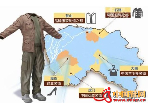 以虎门镇为中心,辐射长安、厚街等镇区,主要生产时尚女装、休闲装、童装等;以大朗镇为中心,辐射常平、寮步等镇区,主要生产毛针织产品;以茶山镇为中心,辐射石龙、东城、石排等镇区,主要生产休闲服、童装、针织T 恤、运动服、内衣裤等;东坑镇则集聚生产洋服的男装企业;以麻涌、洪梅、沙田等镇形成水乡片区,主要从事印染、洗水等环节;中堂镇则主要生产牛仔服装。