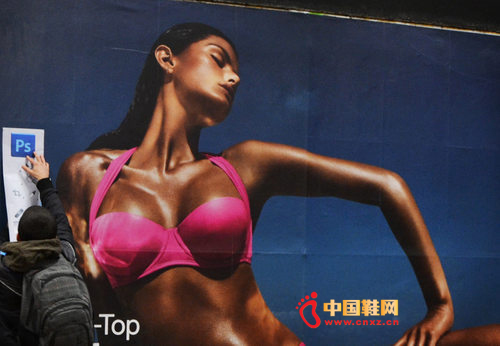 艺术家Daniel Soares在当时选择H&M的一个泳衣广告来证明时尚广告经常对模特身材进行电脑修图。为此他对柏林地铁通道里的广告牌进行了“破坏广告”行为。现在网上流传的正是他当时发表的图片。(中国鞋网-最权威最专业的鞋业资讯中心。合作媒体: 迷彩鞋)