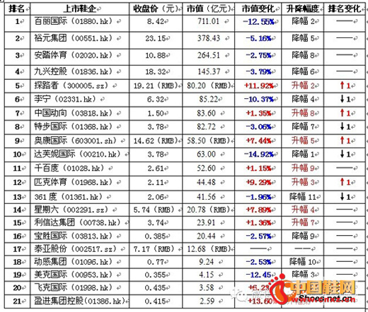 2、市值变化、排名变化参照2014年1月15日。中国鞋网-最权威最专业的鞋业资讯中心。合作媒体: