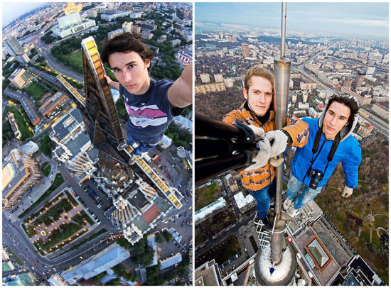 这一系列的特技名为“勇攀高楼”,曾经在俄罗斯和乌克兰很受欢迎。参与者们没有任何保护措施,完全靠的是自身的胆量。他们有时是朋友在旁边帮忙拍,有时甚至是自己空出一只手来疯狂地自拍。科里尔的朋友穆思丹甚至在离地数百米的高楼上做起了引体向上。虽然是在如此危险的境况下拍摄,他们脸上的表情都很淡定,没有一丝恐慌。