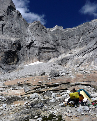 Chad Kellogg在色尔登普峰大岩壁下展示8264旗帜
