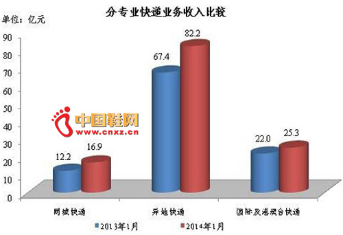 【中国鞋网-数字新闻】2014年1月,受春节假期因素影响,全行业同比增速有所放缓,但仍保持较高水平。邮政企业和全国快递服务企业业务收入(不包括邮政储蓄银行直接营业收入)完成254.2亿元,同比增长18.7%;业务总量完成259.2亿元,同比增长23.3%。