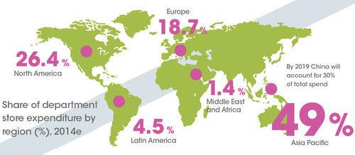 亚太区占全球百货公司销量的49%之多,其次是北美的26.4%,欧洲的18.7%,南美则达到4.5%,中东则是1.4%。