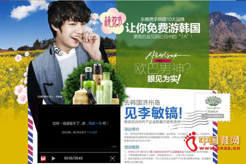 【中国鞋网-滚动快讯】乐蜂桃花节带网友免费游韩国,亲密接触李敏镐、EXO!2月27日-3月1日桃花节期间,凡乐蜂网的会员,购买“免费游韩国”专场活动的10个韩国品牌任意产品,就有机会加入乐蜂网的免费韩国之旅。