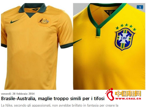 【中国鞋网-品牌动态】在巴西世界杯中,巴西队和澳大利亚队的战袍均由公司设计,两支球队战袍的相似度太高,引起了双方球迷不满。《罗马体育报》报道,耐克公司有可能会重新设计这两套战袍。
